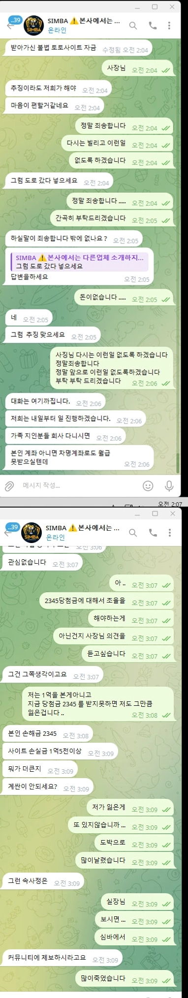 '심바' 먹튀사이트는 당첨금 지급을 회피하기 위해 협박을 동원하고, 오랜 기간 충성했던 회원에게조차 가차 없이 자금을 편취하는 악랄한 방식을 사용합니다. 이는 일반적인 소액 먹튀를 넘어, 고액과 오랜 기간 이용한 유저를 대상으로 먹튀를 일삼는 매우 위험한 곳임을 명백히 보여줍니다.