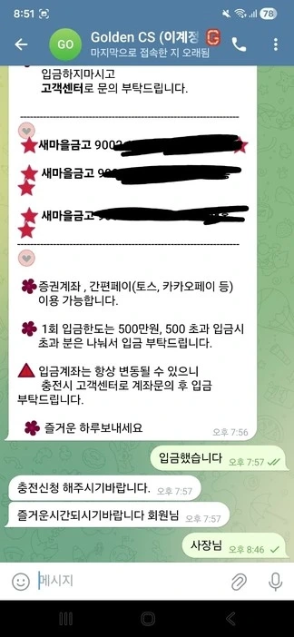 이처럼 '골든카지노'는 이용자를 유인한 뒤 소액 당첨금에 대해서도 환전 지연, 계정 차단, 소통 단절 등의 수법을 통해 먹튀를 저지르는 악질적인 운영을 이어가고 있습니다.