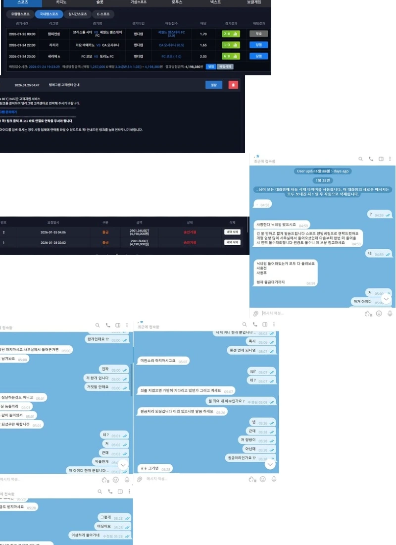 개인 텔레그램을 통한 협박: 더욱 충격적인 것은, 이용자가 렛츠벳 고객센터에 연락했음에도 불구하고, 사이트 관계자로 추정되는 인물이 개인 텔레그램으로 연락을 취해 협박까지 했다는 점입니다. 이는 정식적인 고객 응대를 회피하고 이용자를 위협하여 피해를 무마하려는 비열한 행위입니다.